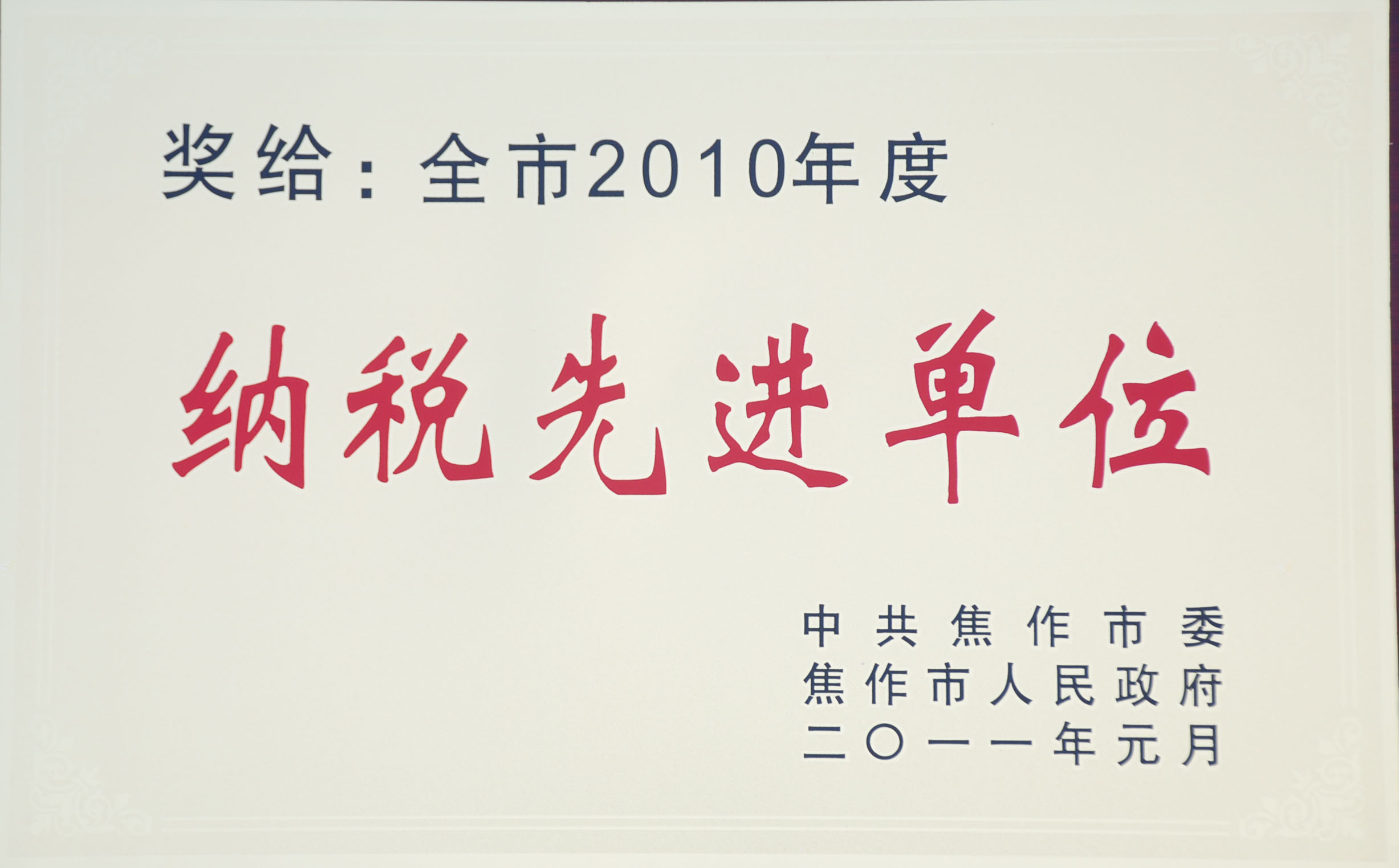 2月14日 市政府召開財(cái)稅及工業(yè)發(fā)展總結(jié)表彰大會。公司被焦作市委、市政府授予全市2010年度“納稅先進(jìn)單位”稱號。(公司辦)